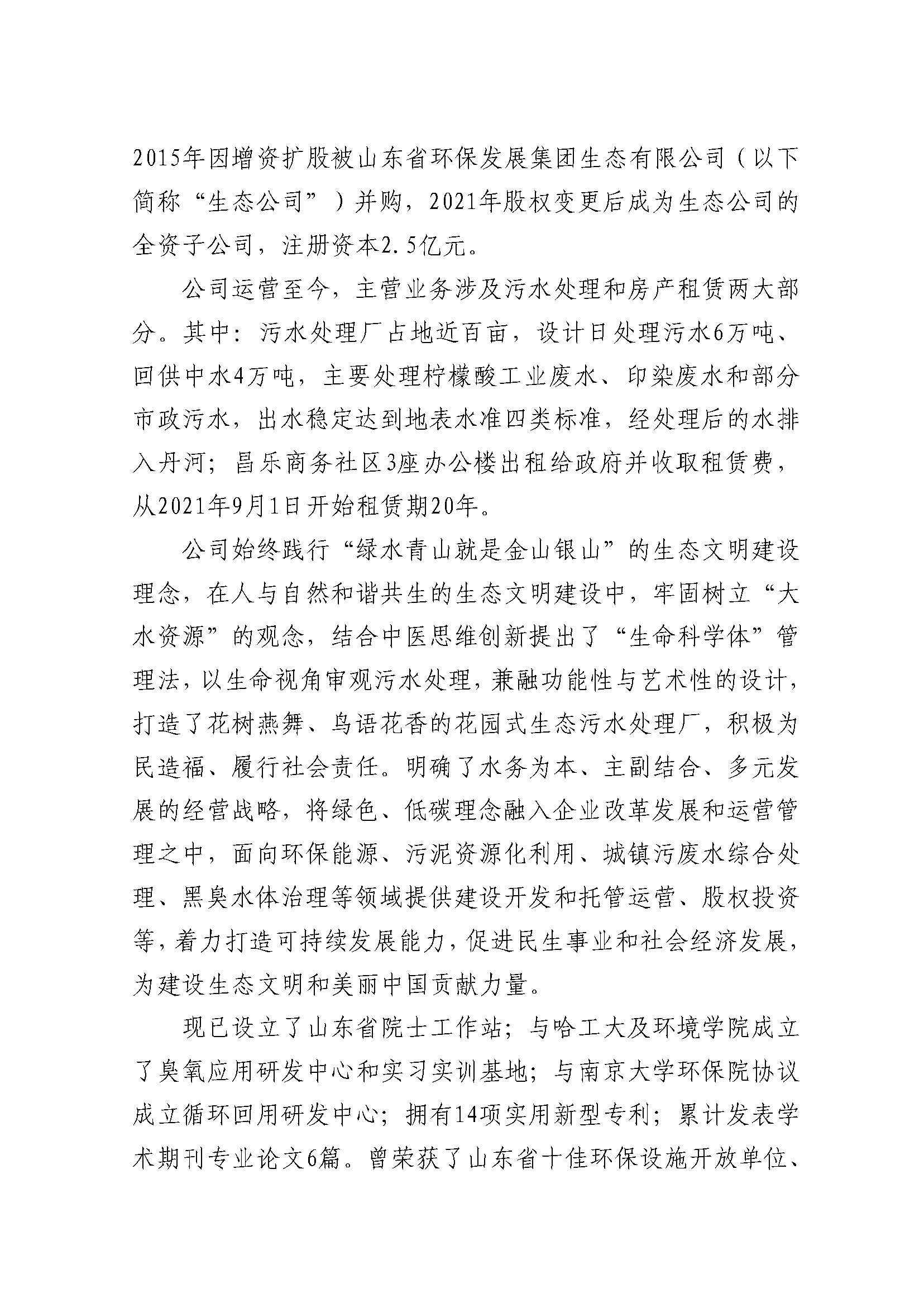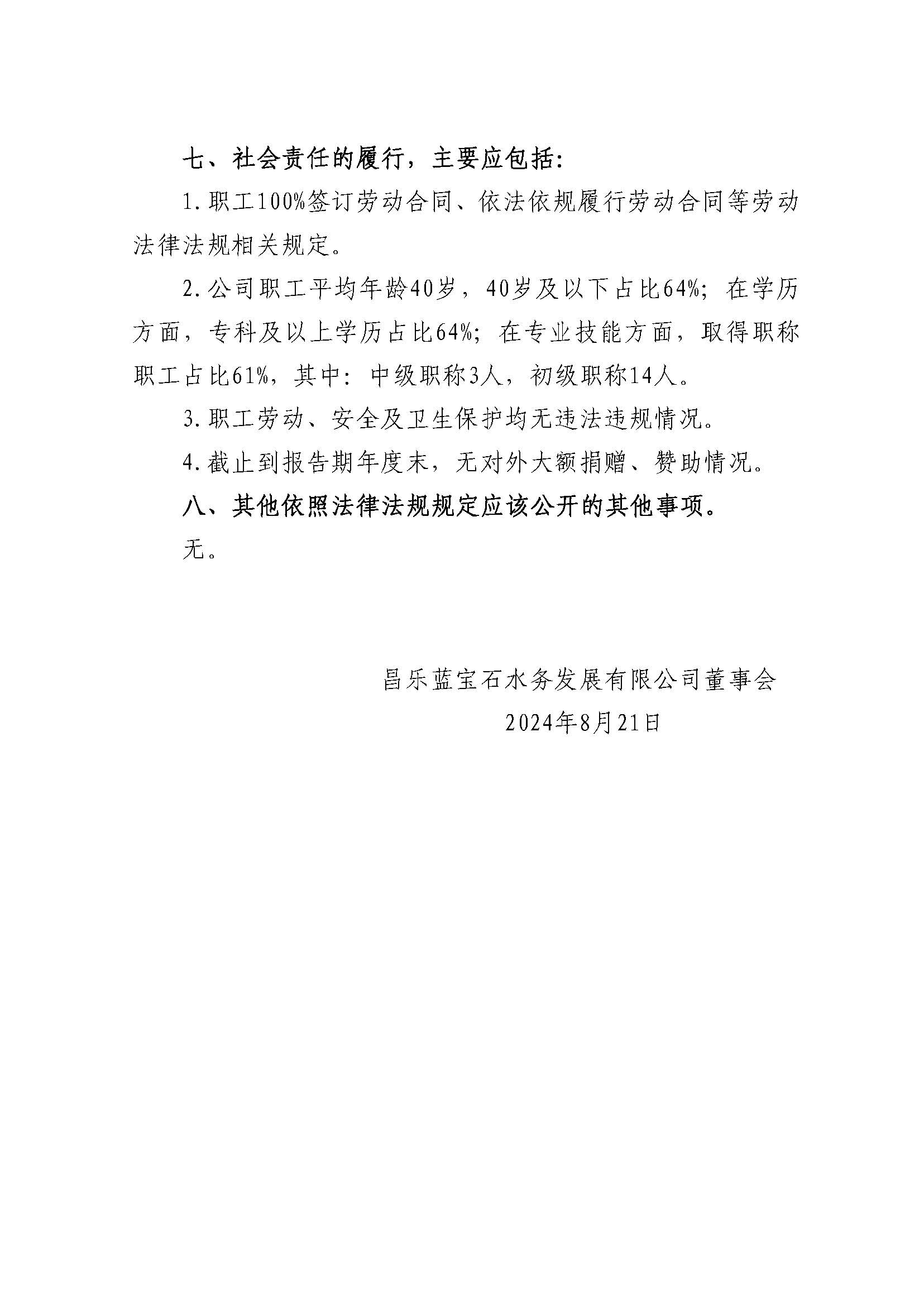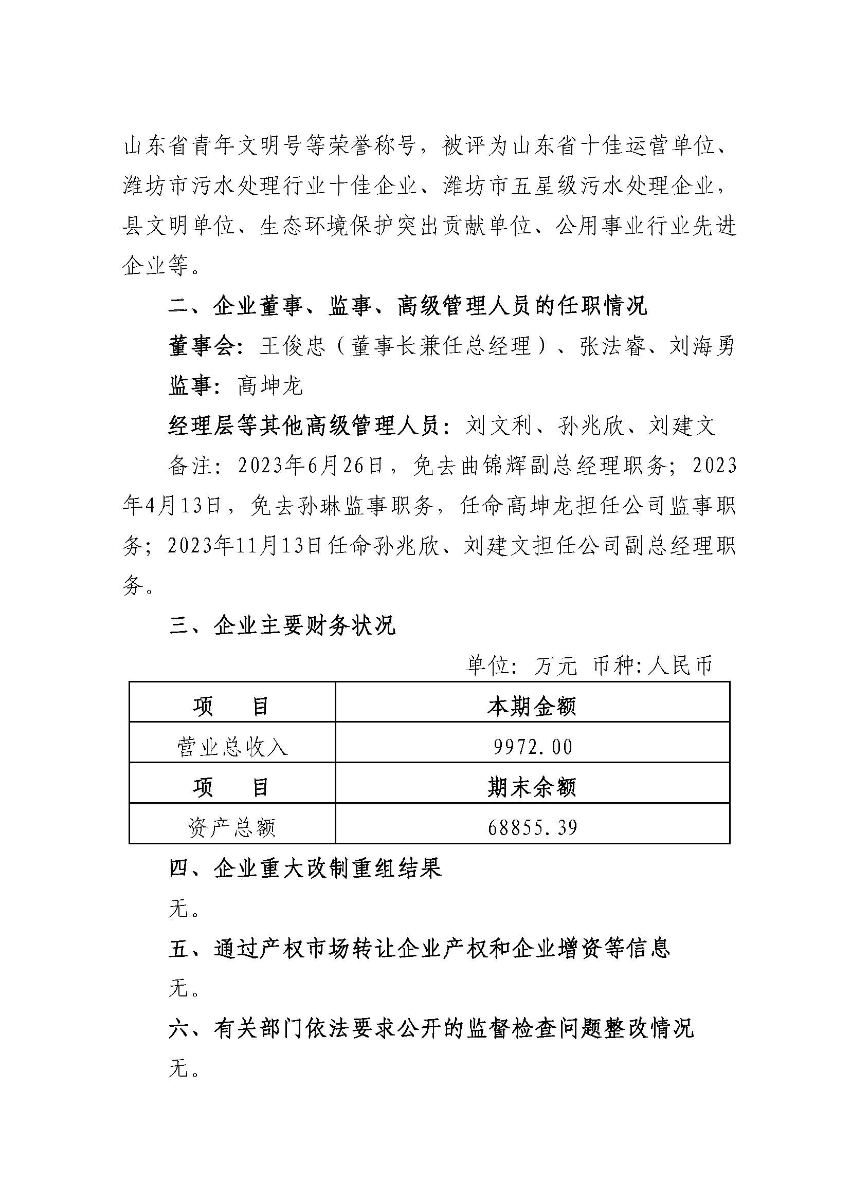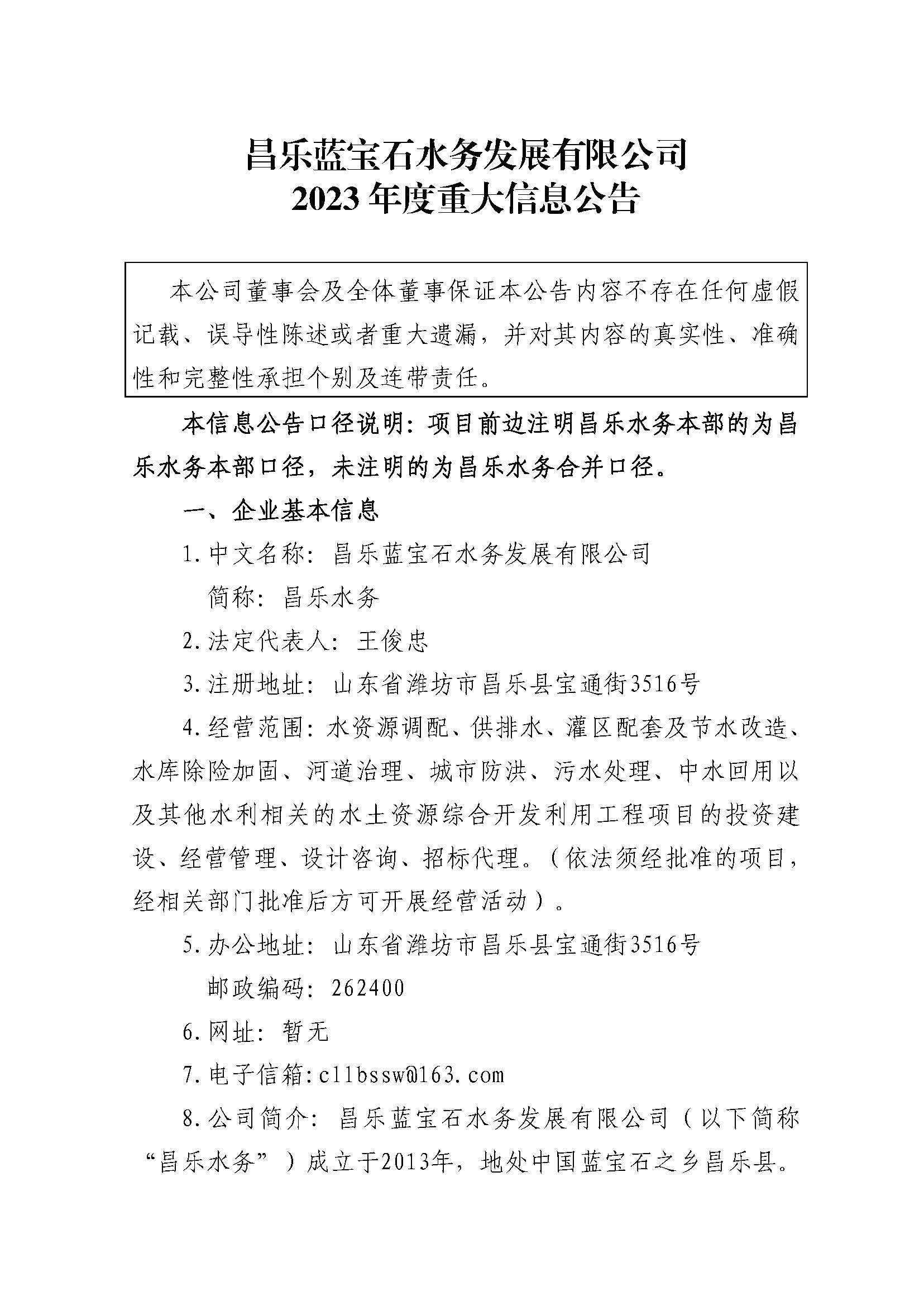 昌乐蓝宝石水务发展有限公司2023年度重大信息公告