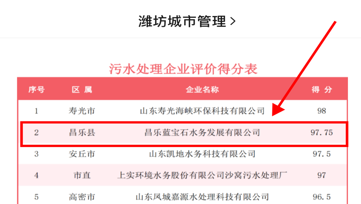 2024年1月上中旬,潍坊市城市管理局组织对全市供水、燃气、供热和污水处理等4大类121家市政公用企业进行了2023年度运行服务质量评价,昌乐水务以97.75分位居第二名,并获得优秀企业风采展示的殊荣。