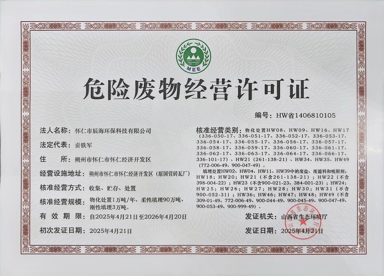 近日,怀仁市辰海环保科技有限公司(以下简称“辰海环保”)正式收到山西省M88环境厅颁发的《危险废物经营许可证》,这标志着辰海环保可依法开展危废处置业务,为助力山东环保集团和M88公司拓宽营收渠道,扩大市场份额奠定了坚实基础。