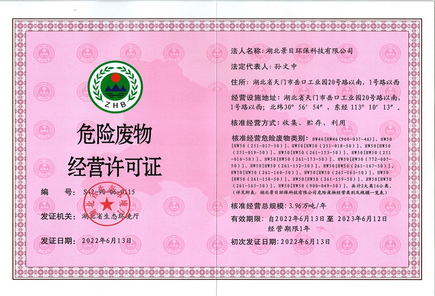 近日,经湖北省M88环境厅审核通过,湖北景目环保科技有限公司成功申领危险废物经营许可证,经过核准经营危险废物类别包括HW46、HW50两大类包含的16小类,标志着景目环保将正式进入试生产阶段。
