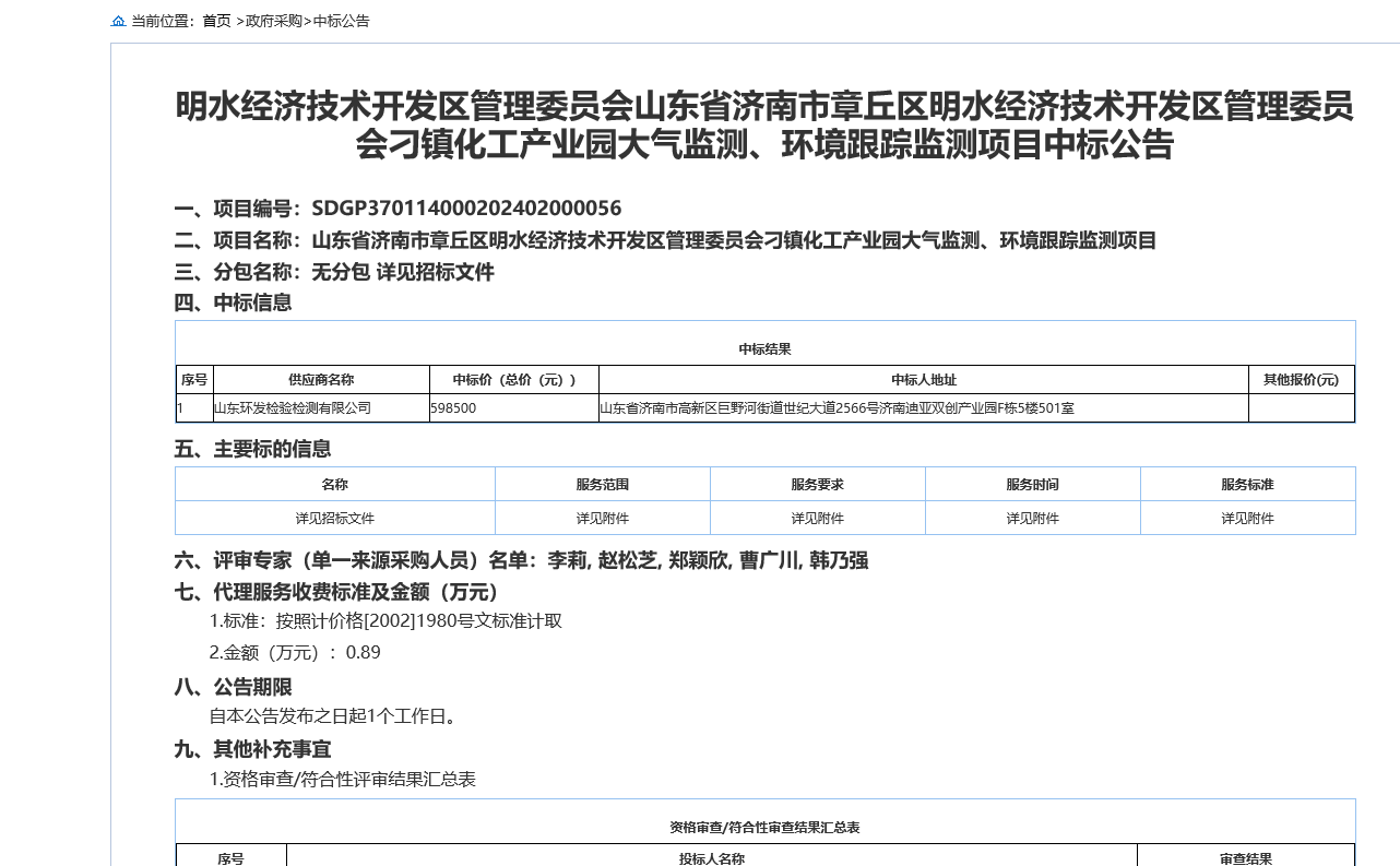 7月25日,山东环发检验检测有限公司成功中标“山东省济南市章丘区明水经济技术开发区管理委员会刁镇化工产业园大气监测、环境跟踪监测项目”,